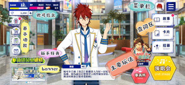 在偶像夢幻祭2游戲中,萌新玩家怎么玩?相信很多玩家都不知道,今天小編就給大家?guī)砹嗣刃滤俪晒ヂ裕M梢詭偷酱蠹?,為了方便大家查看,主要將界面分為以下幾個區(qū)域(詳情看圖)。