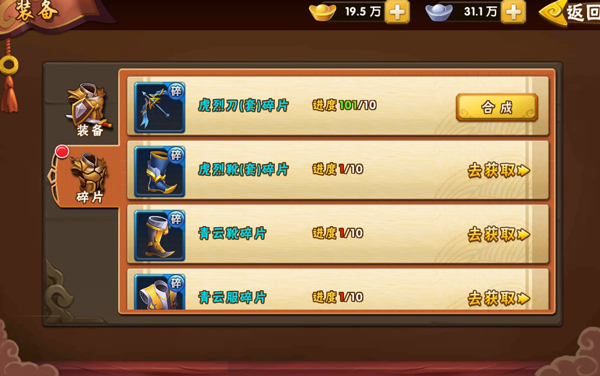 選擇右側(cè)的“碎片”頁簽進(jìn)行切換,顯示玩家獲得的所有裝備碎片。如果有滿足合成條件數(shù)量的碎片,出現(xiàn)合成按鈕,點(diǎn)擊合成。