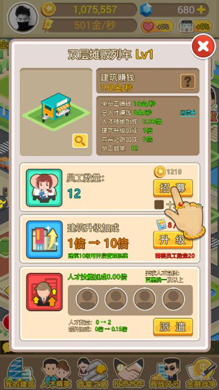 招募員工是快速提升賺錢速度方式之一,只需要花費金幣就可以提升賺錢速度,當(dāng)然花費的金幣數(shù)量也是逐漸遞增的。升級建筑等級則能提供吸引人的倍數(shù)加成,升級需要的建筑卡可以通過商戰(zhàn)兌換或商店購買獲得。