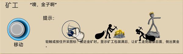 輕觸或按住開采圖標(biāo):接近金礦時。顯示礦工包裝滿后,讓礦工走到雕像后面,倒出黃金,完成收集。