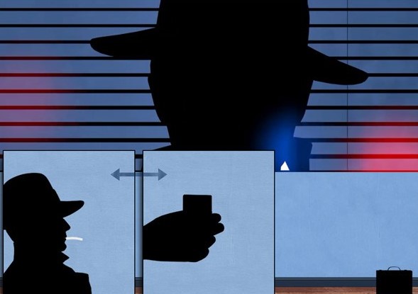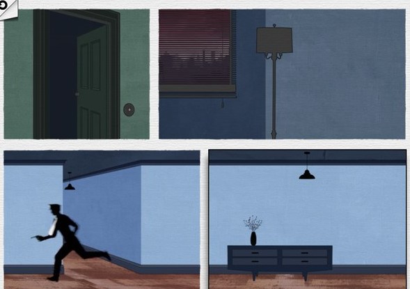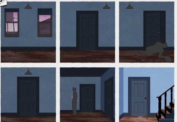 隨后來到了第三個場景,倒霉的主人公在眾多的房間當(dāng)中穿梭,卻不料RP不好,亂了陣腳,被守株待兔的警察給逮了個正著……如果我們按照下圖移動插畫的位置,主人公的RP爆表,錯過了警察之后便可以從樓梯逃走。小編也不知道怎么回事,自從玩了致命框架攻略之后也忍不住站在了我們的主人公這邊,明知與警察作對實則不對,卻還是忍不住為逃過一劫又一劫的黑衣人拍手叫好。