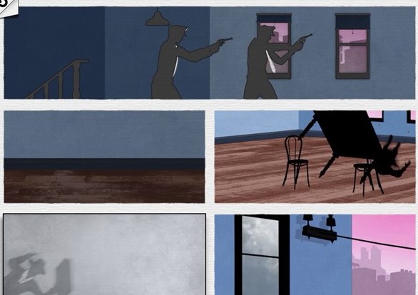 如下圖所示調(diào)轉(zhuǎn)圖片位置,當(dāng)警察開槍射擊的時候,主人公飛身一躍,桌子側(cè)翻在地擋住了子彈,主人公便可以趁此機會跳窗逃走!正字啊看小編此篇致命框架攻略的你是不是也被主人公矯健的身姿所折服!