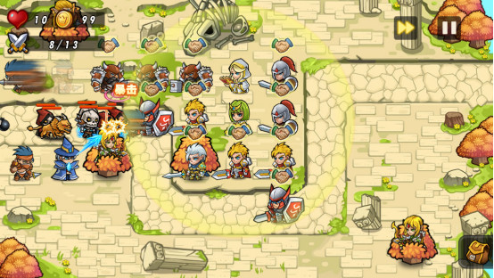 4、最終陣型:優(yōu)先把護衛(wèi)放滿,然后升級樹上的神射手,再然后優(yōu)先把護衛(wèi)旁邊的大劍士升出來(護衛(wèi)旁邊boss停留時間長,輸出環(huán)境好),富余的錢如圖把所有劍士連成一片,團結(jié)起來!