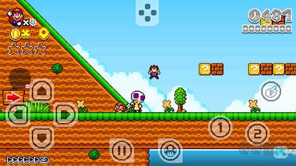 3、向上按鈕是控制馬里奧的跳躍,游戲還是比較經(jīng)典的,屬于那種逼真的恢復(fù)馬里奧游戲;