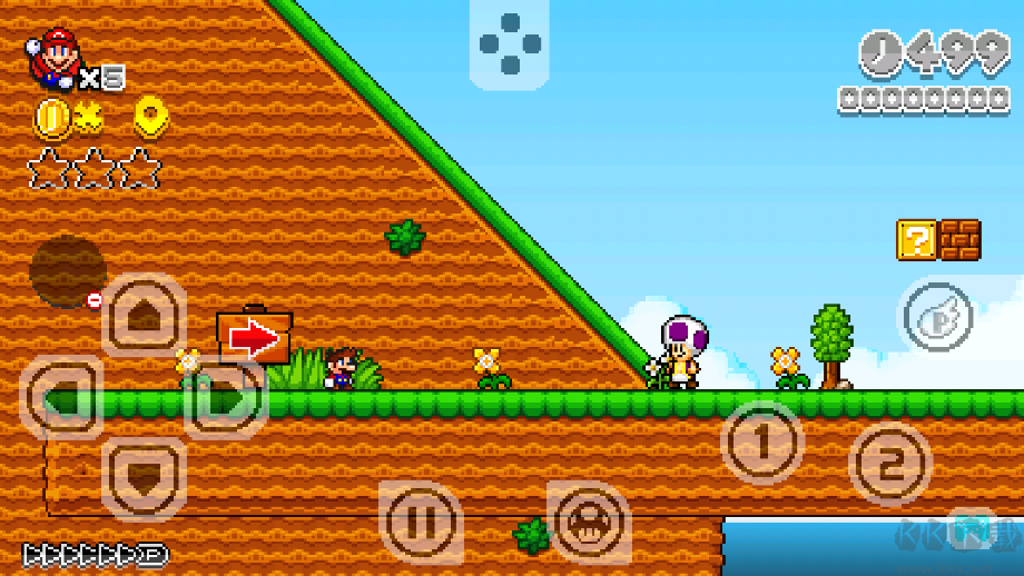 1、游戲玩法非常簡(jiǎn)單,通過(guò)虛擬按鈕來(lái)控制,在屏幕下方的左右按鈕是控制馬里奧的前進(jìn)和后退;