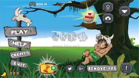 游戲首頁(yè),所有的顯示都是英文的,這里,我給大家介紹幾個(gè)主要的:play(開(kāi)始游戲);help(幫助:里面講解的是你在游戲中會(huì)用到的一些技能);shop:(商店)。圖中左下角的香蕉顯示額,代表的是你的金幣剩余。在游戲中我們可以通過(guò)兩種途徑獲得金幣。第一種:我們可以通過(guò)觀看游戲中的視頻;第二種:再每一局闖關(guān)成功后,會(huì)有金幣獎(jiǎng)勵(lì)。