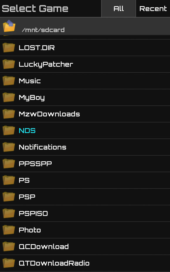 4、很多人反應(yīng)找不到ROM,以本人為例,在SD卡根目錄建了個(gè)NDS文件夾用來放ROM,文件夾名字不重要,重要的是你認(rèn)得它就行了: