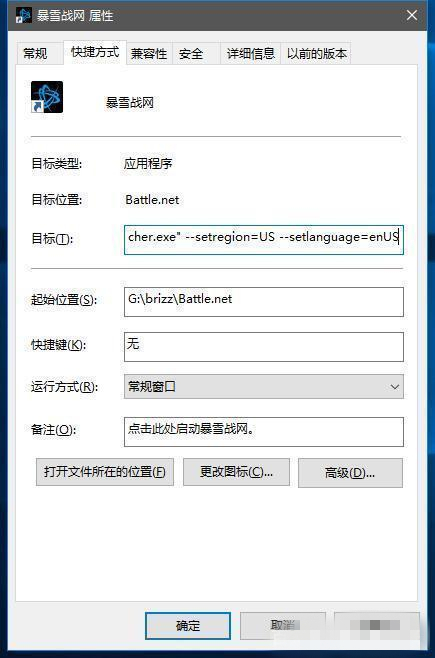 接下來右鍵點擊桌面戰(zhàn)網(wǎng)客戶端屬性,在目標(biāo)一欄的最后面復(fù)制 (--setregion=US --setlanguage=enUS),一定要記得把括號刪除,文本中是有空格的哦。