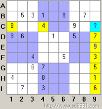 由基礎(chǔ)摒除法,第A7所在的九宮格內(nèi)9只有一個(gè)唯一的位置,即確定C8=9。