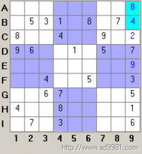 A4=9,則4列其它格排除9,G1=9,第G行排除數(shù)字9,H9=9,第H行排除數(shù)字9。