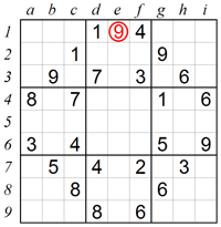 數(shù)獨(dú)的網(wǎng)格是由81個(gè)方塊組成,這81個(gè)方塊被劃分為9列(第a列到第i列)以及9行(第1行到第9行)。該網(wǎng)格也被劃分成了9個(gè)3x3的被稱為宮的小網(wǎng)格,及第1宮到第9宮。