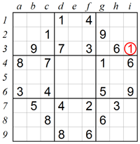 同樣的技巧也可以擴(kuò)展到相互垂直的行與列中。讓我們想一下第3宮中1應(yīng)該放在哪里。在這個(gè)例子中,第1行以及第2行已經(jīng)有1了,那么第3宮中只有底部的倆個(gè)空格可以填1。不過,方格g4已經(jīng)有1了,所有第g列不能再有1。所以i3是該宮唯一符合條件填上數(shù)字1的地方。