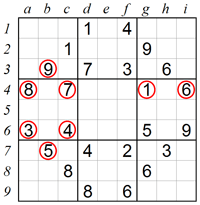 通常地,一個(gè)方格只能有一個(gè)數(shù)字的可能性,因?yàn)槭O碌钠渌?個(gè)數(shù)字都已經(jīng)被相關(guān)的行列宮所排除了。我們看一下下面例子中b4這個(gè)方格。b4所在的宮中已經(jīng)存在了數(shù)字3,4,7,8,1和6位于同一行,5和9位于同一列,排除上述所有數(shù)字,b4只能填上2。