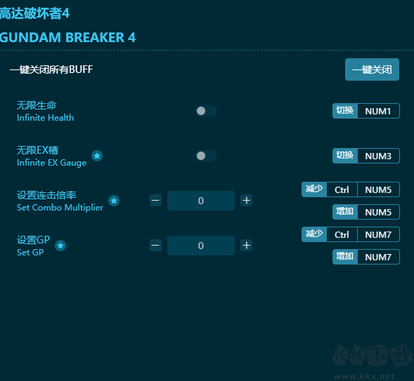 高達(dá)破壞者4二十四項修改器鍵位功能介紹: