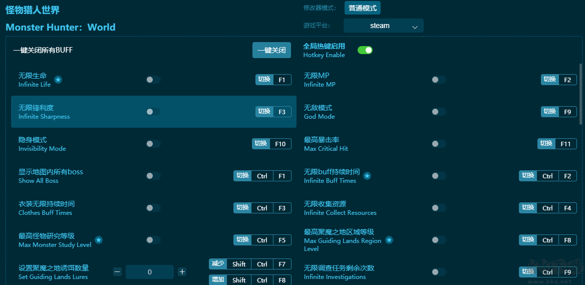怪物獵人世界三十八項(xiàng)修改器鍵位功能