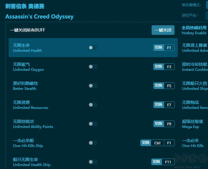 刺客信條:奧德賽二十八項修改器鍵位功能介紹: