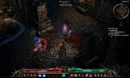 3、沿著大路走,進(jìn)入殮葬洞穴,干掉紫名boss,完成波旁隊(duì)長(zhǎng)交給你的第一個(gè)任務(wù)。圖中綠色是虛化結(jié)晶——洗星座,制作裝備材料主要掉落來源,打爛。祭壇留著,回來再點(diǎn)。接下來去競(jìng)技場(chǎng)。
