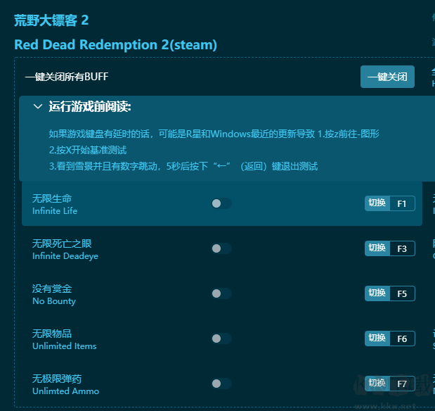 1.“無限生命”、“無限體力”、“無限死亡之眼”、“馬:無限生命”、“馬:無限體力”等功能在對應數(shù)值減少時生效。