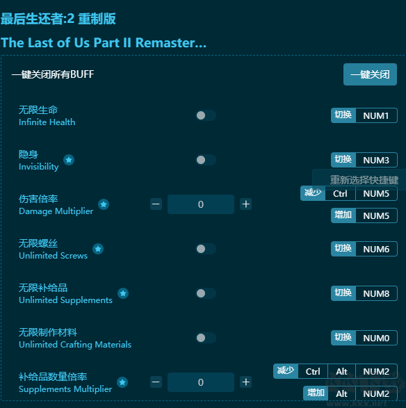最后生還者2重制版十項(xiàng)修改器鍵位說(shuō)明