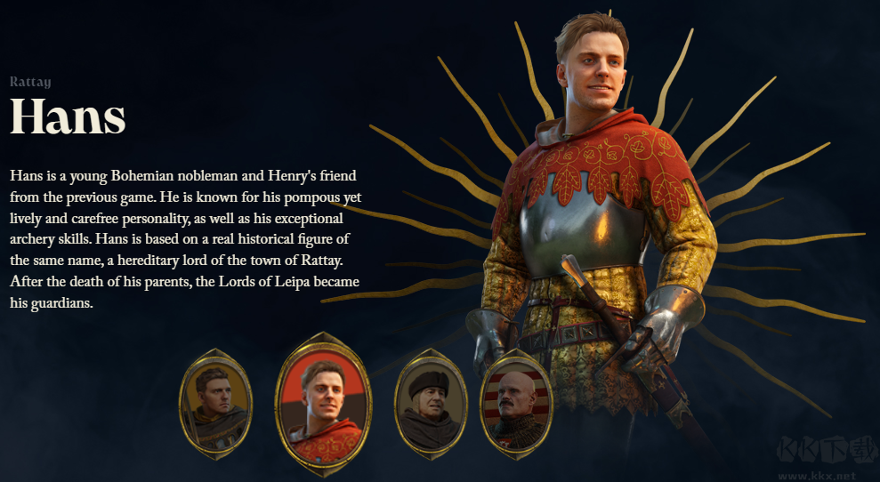 漢斯是一位年輕的波西米亞貴族,也是亨利在前作中的朋友。他以其浮夸而活潑和無(wú)憂(yōu)無(wú)慮的個(gè)性以及非凡的射箭技巧而聞名。漢斯 (Hans) 是根據(jù)同名的真實(shí)歷史人物改編的,他是拉泰鎮(zhèn)的世襲領(lǐng)主。在他的父母去世后,萊帕的領(lǐng)主成為了他的監(jiān)護(hù)人。