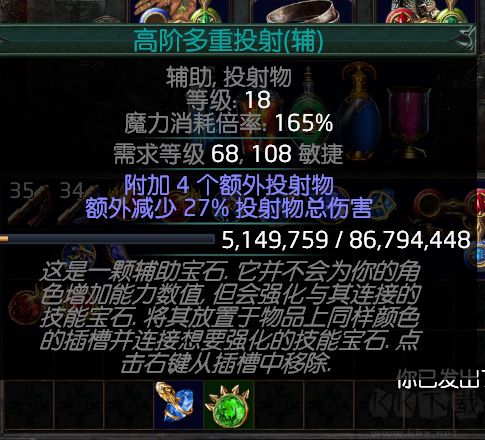 8、技能寶石、鼠標(biāo)放技能寶石上可看說明,最上面有 “投射物” 等屬性,輔助技能需從中選且?guī)?“輔助” 二字??滓B起來,主技能和輔助寶石才生效