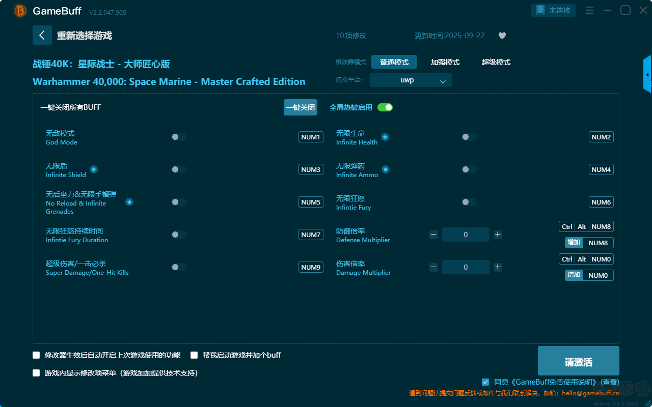 戰(zhàn)錘40K星際戰(zhàn)士10項修改器pc大師匠心版是一款功能強大的游戲輔助器,支持為游戲戰(zhàn)錘40K星際戰(zhàn)士開啟無敵模式、無限生命、無限盾、無限彈藥、無后坐力 & 無限手榴彈、無限狂怒、無限狂怒持續(xù)時間等修改功能。在修改器中你可以在普通模式、加強模式、超級模式三個模式中任意選擇開啟一個模式,體驗全新游玩過程。需要的小伙伴快來KK下載站下載使用吧。