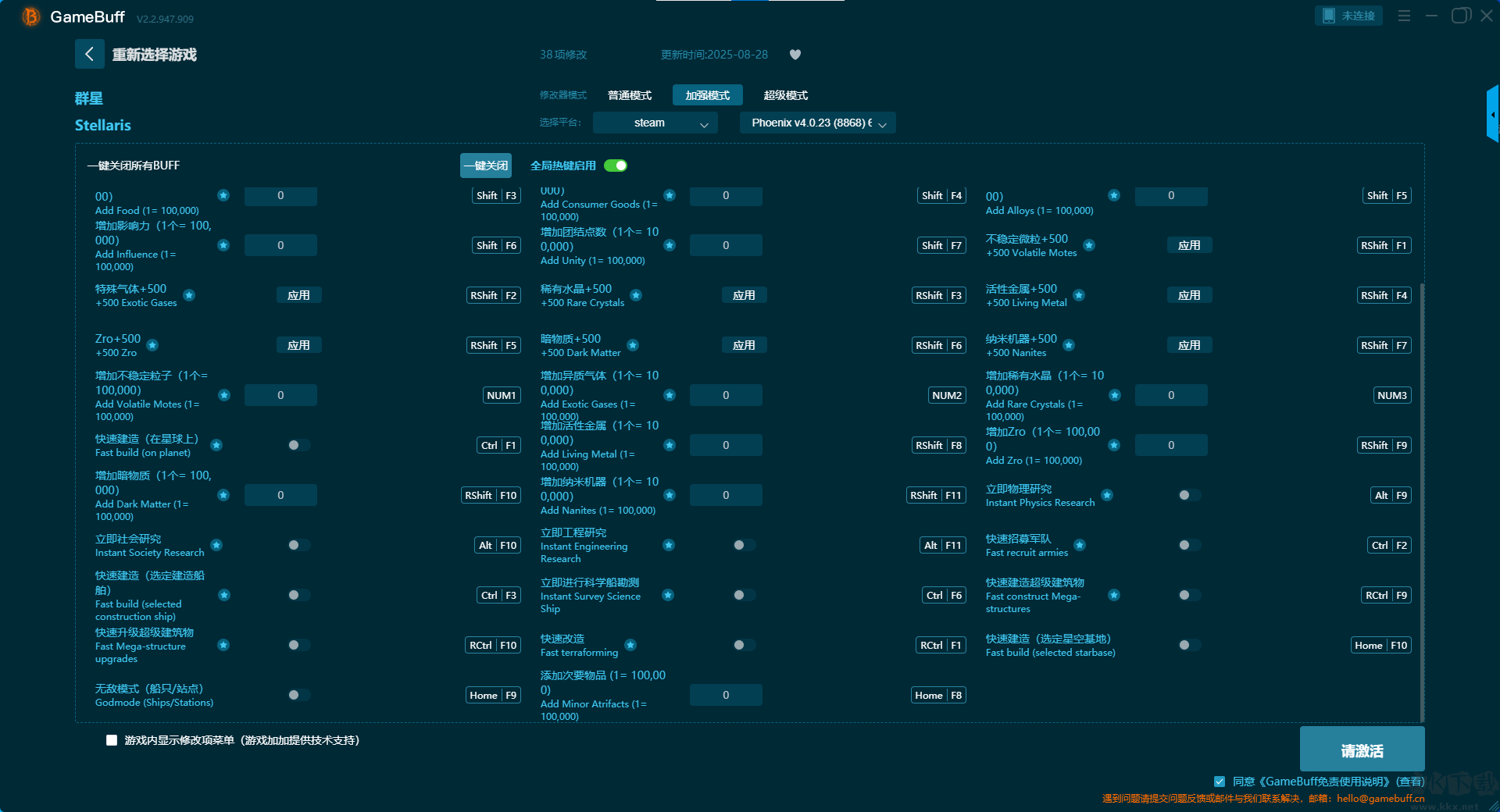 群星(Stellaris)二十四項(xiàng)修改器pc專業(yè)版是一款為游戲群星專項(xiàng)設(shè)計(jì)的游戲輔助修改功能。支持在游玩過程中開啟普通模式、加強(qiáng)模式、超級(jí)模式三項(xiàng)強(qiáng)大的輔助模式,你可以自由的在游玩過程中使用快捷鍵開啟關(guān)閉其中的任意一項(xiàng)功能。需要的小伙伴快來KK下載站下載,開啟你在游戲中的無敵之路,留下屬于你的奇妙傳說。