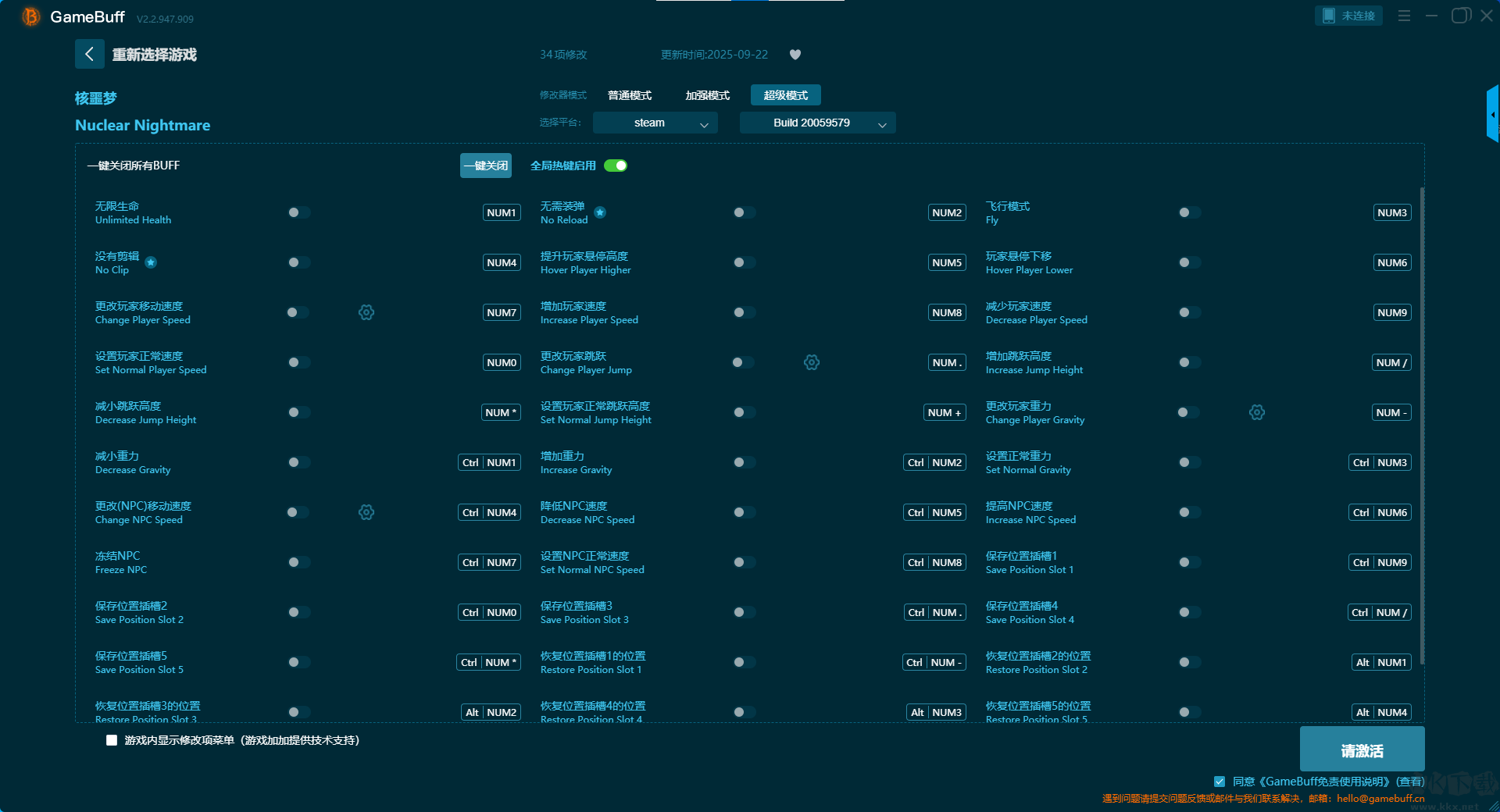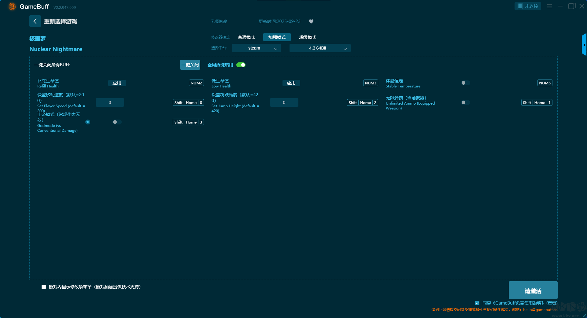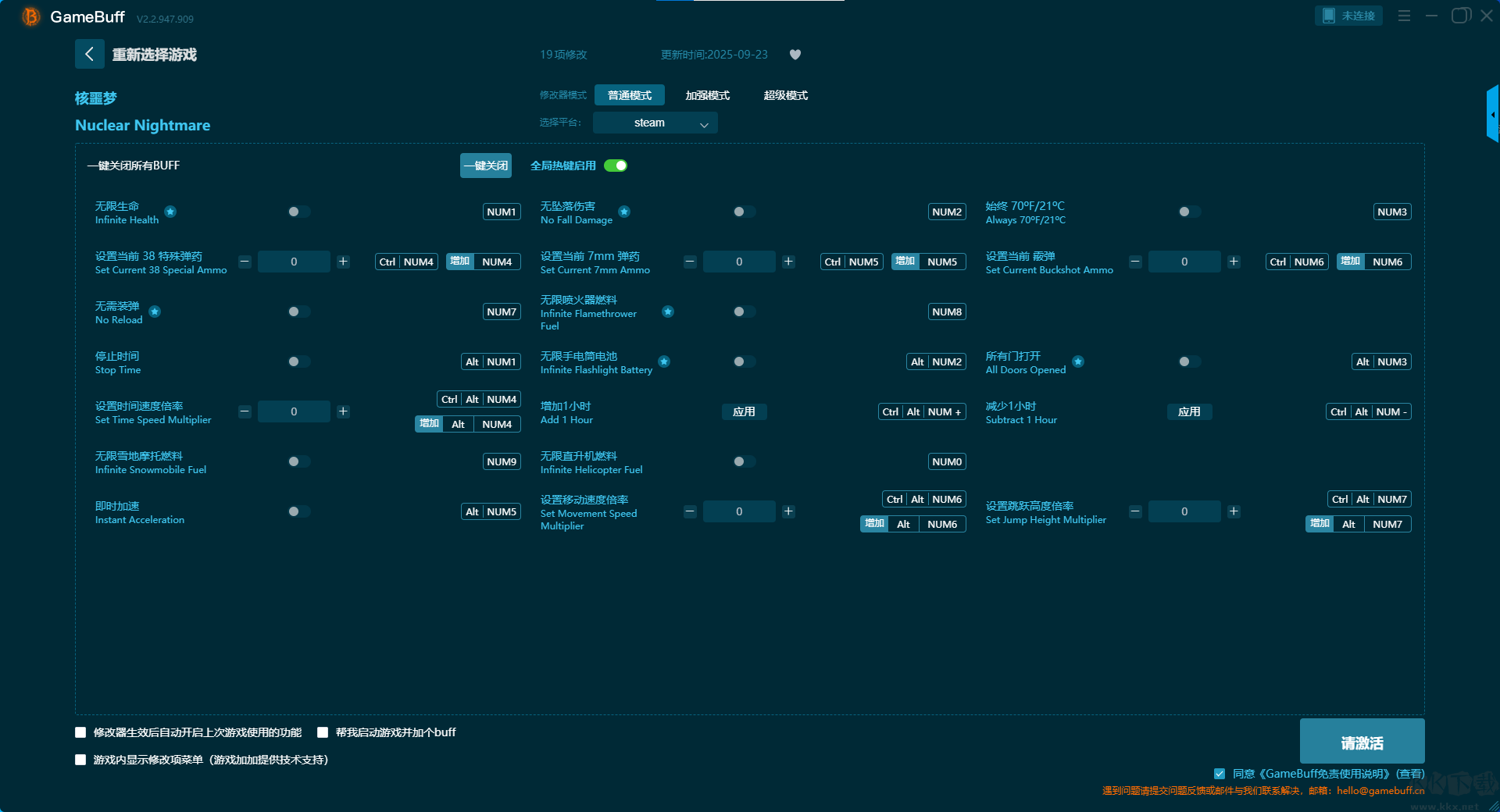 Nuclear Nightmare十九項修改器pc最新版是一款功能強大的游戲輔助修改器。玩家可以為游戲Nuclear Nightmare開啟無限生命、無墜落傷害、始終 70ºF/21ºC、設置當前 38 特殊彈藥、設置當前 7mm 彈藥、設置當前 霰彈、無需裝彈、無限噴火器燃料、停止時間等多達19項功能修改。需要的小伙伴快來KK下載站下載體驗吧。