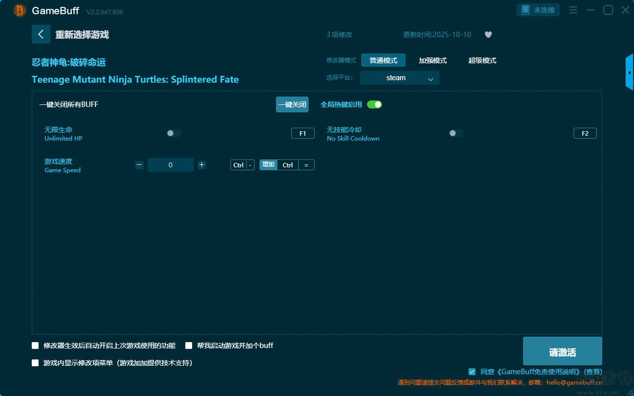 忍者神龜破碎命運(yùn)三項(xiàng)修改器pc官方版是一款使用且功能強(qiáng)大的游戲輔助修改器。玩家可在游玩過(guò)程中在普通、加強(qiáng)、超級(jí)等三個(gè)模式中選擇啟動(dòng),其中超級(jí)模式支持為游戲開(kāi)啟無(wú)限生命、技能快速冷卻、弱化敵人、幸運(yùn)骰子、廢料、龍之硬幣、游戲速度七項(xiàng)強(qiáng)大功能。喜歡的小伙伴快來(lái)KK下載站下載體驗(yàn)吧。