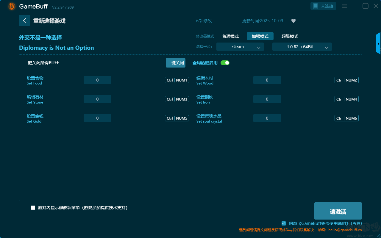 外交不是一種選擇六項修改器pc最終版是一款可以為游戲外交不是一種選擇開啟游戲修改輔助的強大工具。支持steam平臺開啟使用,在游玩的過程中可一鍵開啟設(shè)置食物、編輯木材、編輯石材、設(shè)置鋼鐵、設(shè)置金錢、設(shè)置靈魂水晶六項強大的修改能力。需要的小伙伴快來啊KK下載站下載游玩使用吧。
