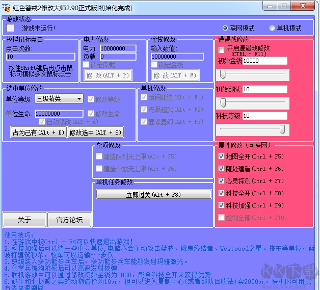 紅警2修改大師是一款非常強(qiáng)大的紅色警戒游戲修改工具,它提供了全功能的修改,不管是金錢(qián)、還是科技、或是速度都超級(jí)強(qiáng)大,還擁有具備地圖全開(kāi)、全圖探測(cè)、金錢(qián)修改、雜項(xiàng)修改、電力修改等實(shí)用功能,本站為大家?guī)?lái)最新版本下載,有需要的玩家不可錯(cuò)過(guò)。