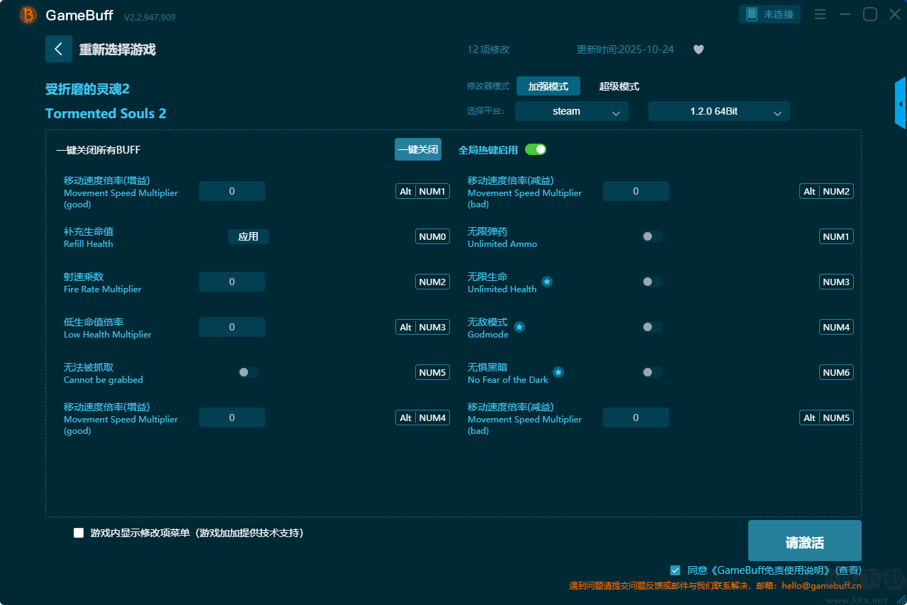 受折磨的靈魂2十二項(xiàng)修改器pc中文版是一款可為游戲受折磨的靈魂2進(jìn)行游戲輔助修改的游戲工具。玩家可在游戲過(guò)程中一鍵開啟,移動(dòng)速度倍率 (增益)、移動(dòng)速度倍率 (減益)、補(bǔ)充生命值、射速乘數(shù)、低生命值倍率、無(wú)法被抓取、移動(dòng)速度倍率(增益)等十二項(xiàng)加強(qiáng)模式修改功能。需要的小伙伴快來(lái)KK下載站下載這款強(qiáng)大的修改器體驗(yàn)使用一下吧。