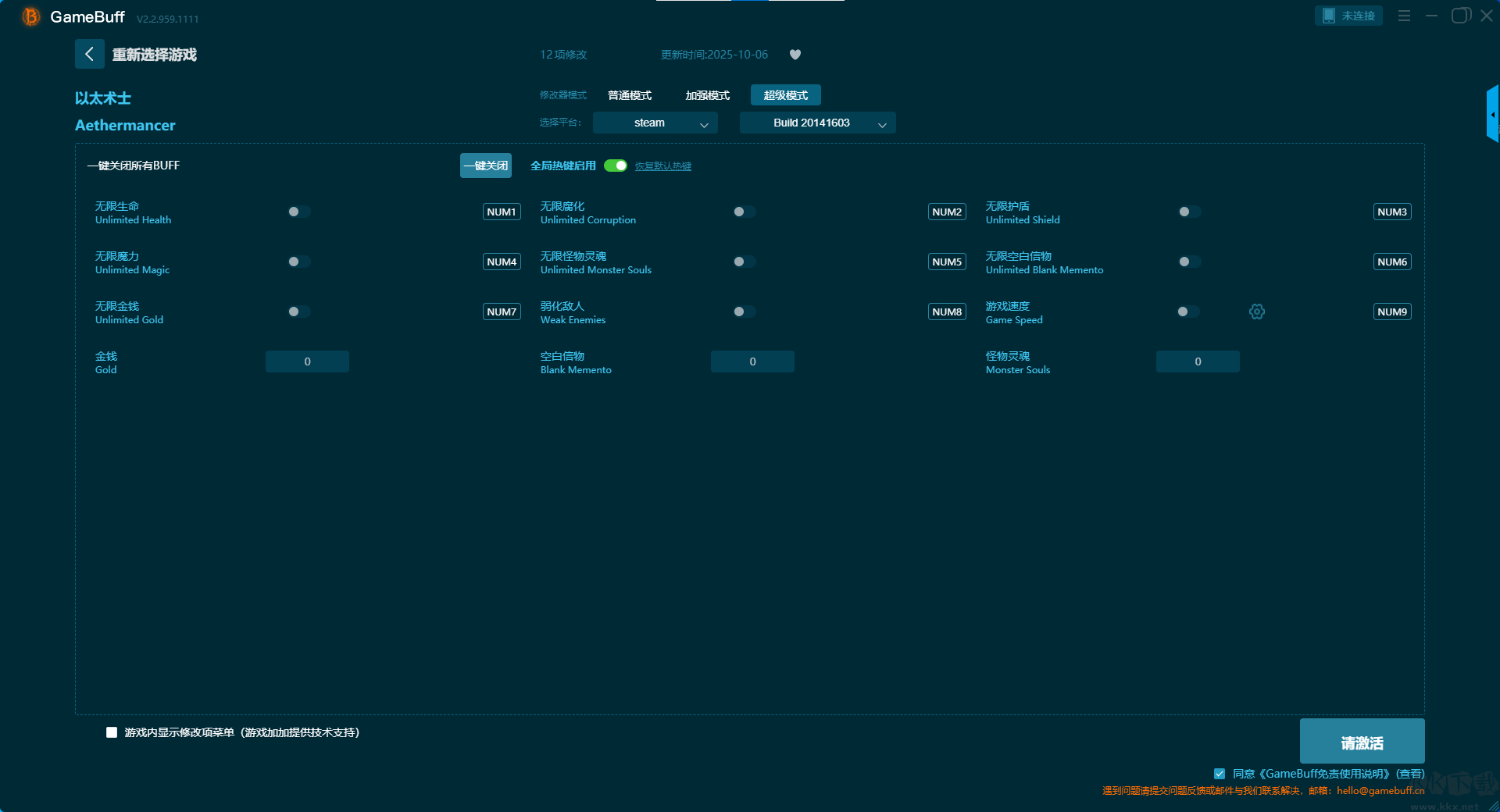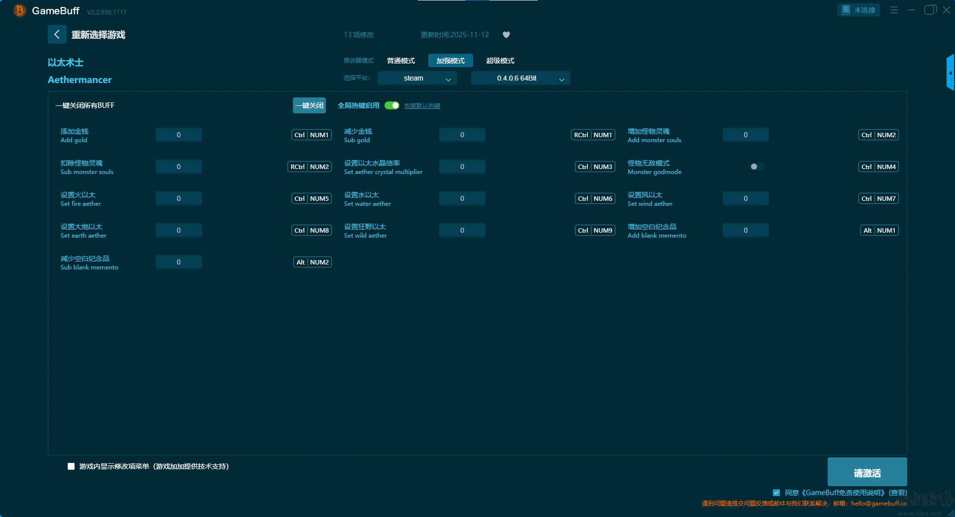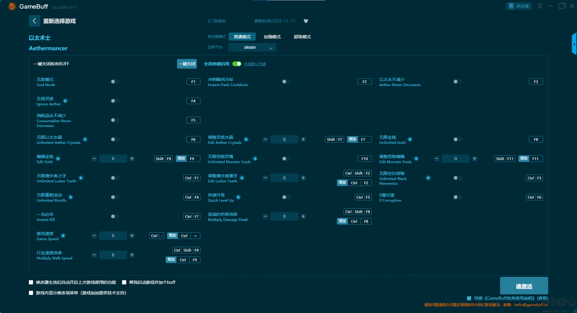 以太術(shù)士二十一項(xiàng)修改器pc單機(jī)版是一款可為游戲以太術(shù)士進(jìn)行游戲輔助修改的輔助工具。支持在steam平臺(tái)使用。玩家可在普通模式中選擇開(kāi)啟,無(wú)敵模式、沖刺瞬間冷卻、以太永不減少、無(wú)視靈質(zhì)、消耗品永不減少、無(wú)限以太水晶、調(diào)整靈質(zhì)水晶等多達(dá)21項(xiàng)修改功能??靵?lái)KK下載站下載這款修改器體驗(yàn)吧。