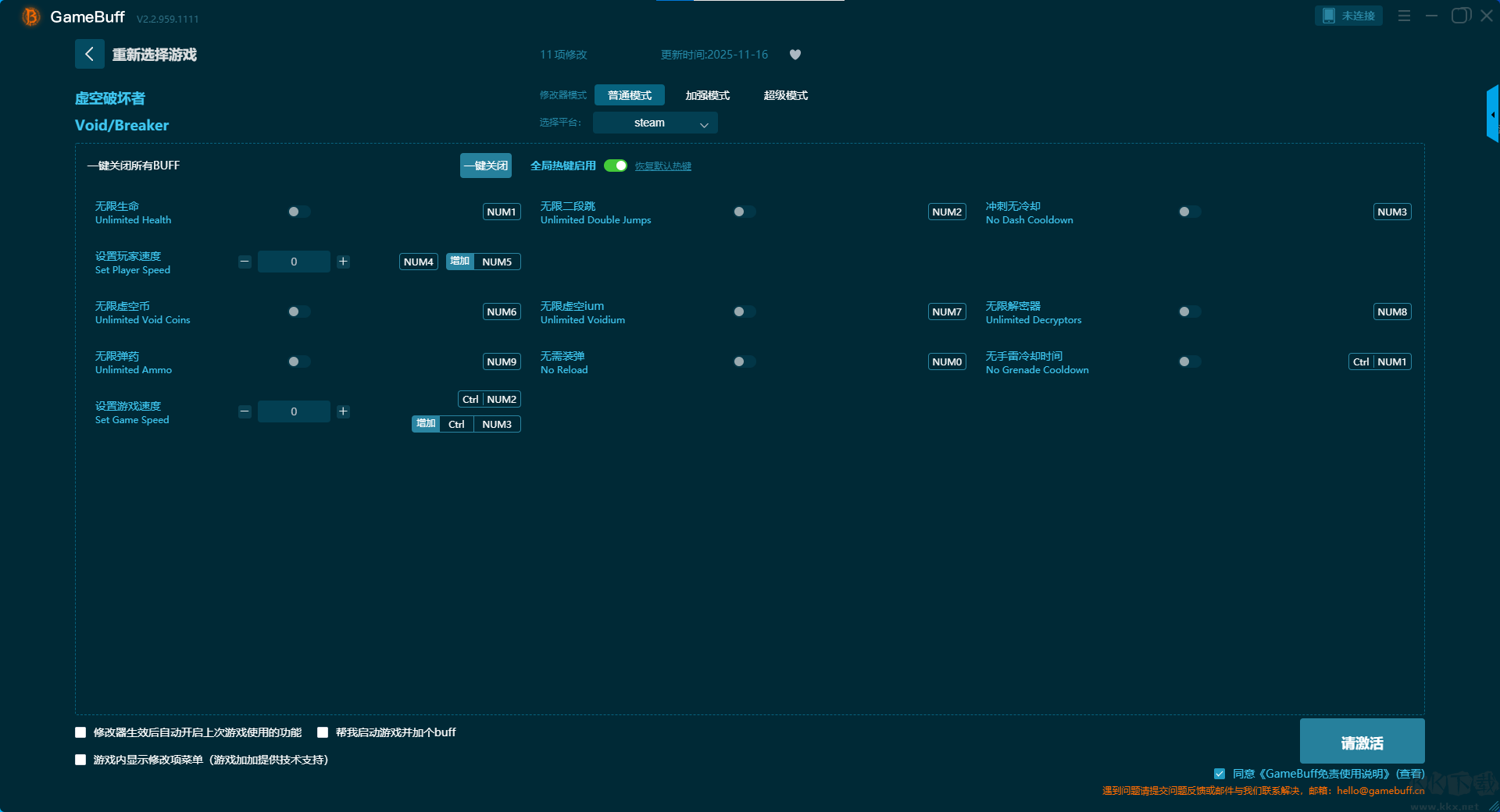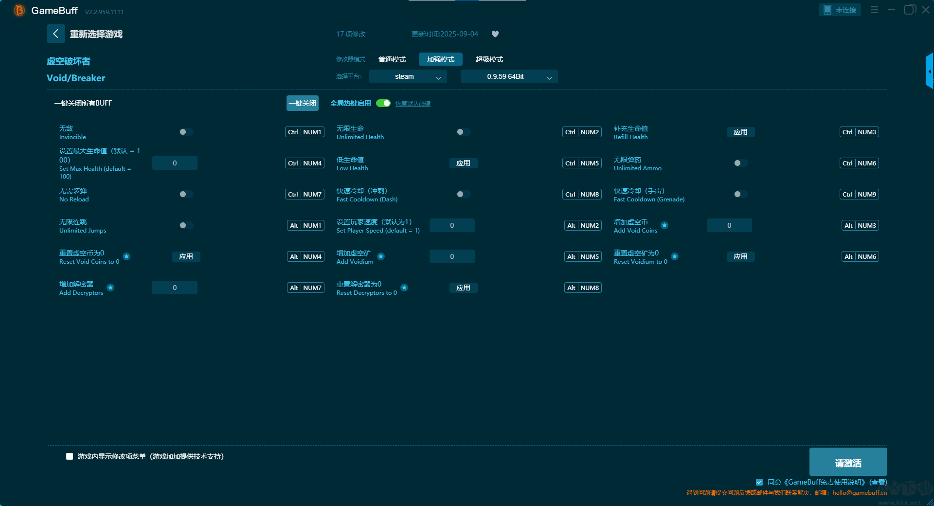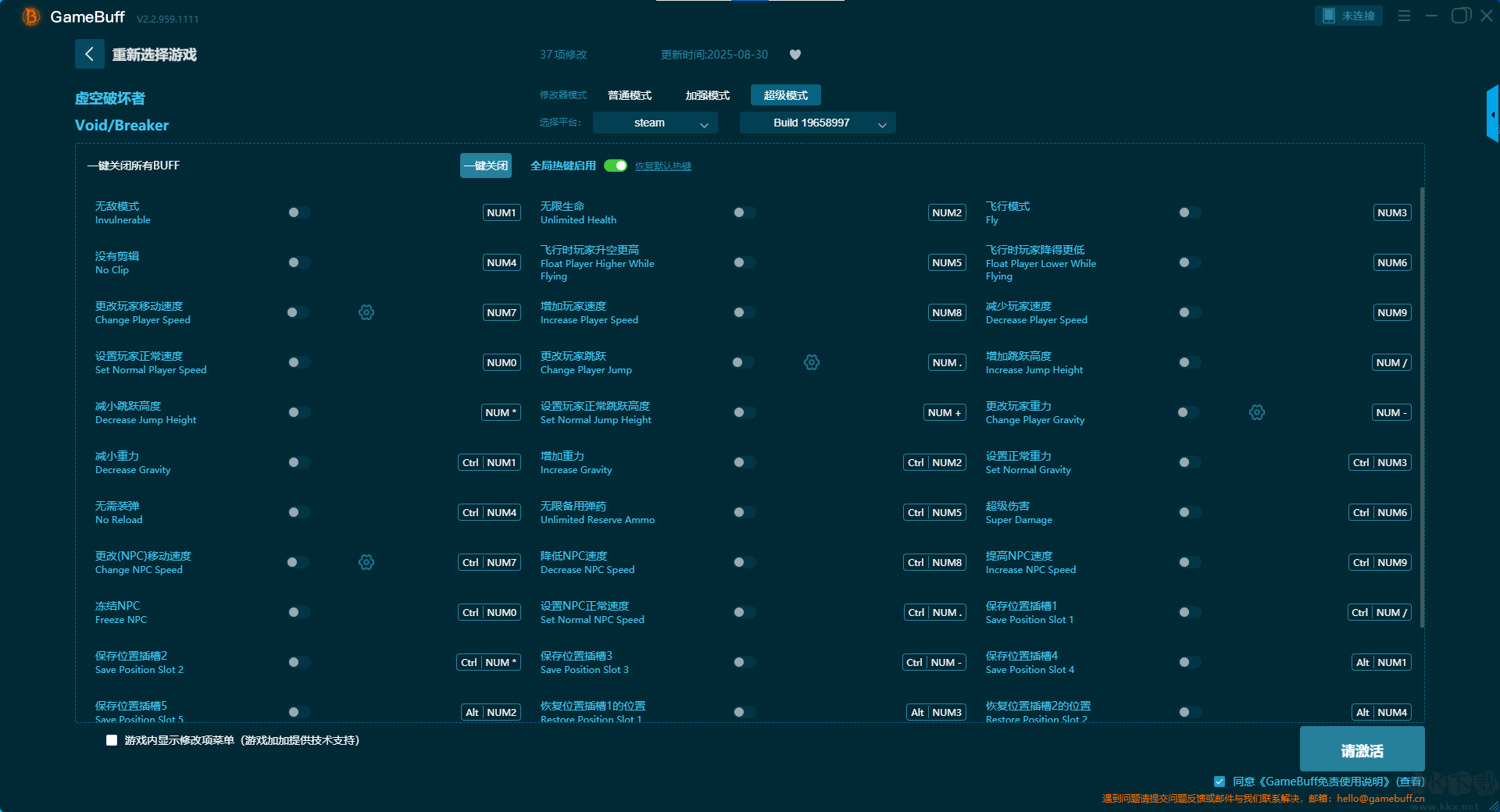 虛空破壞者十一項(xiàng)修改器pc單機(jī)版是一款擁有超一百種修改功能的游戲輔助修改器。玩家可在這款虛空破壞者游戲的游玩過(guò)程中一鍵開(kāi)啟,無(wú)限生命、無(wú)限二段跳、沖刺無(wú)冷卻、設(shè)置玩家速度、無(wú)限虛空幣、無(wú)限虛空礦、無(wú)限解密器等多項(xiàng)修改功能。需要這款修改器的小伙伴可以來(lái)KK下載站下載體驗(yàn),開(kāi)啟你的無(wú)線(xiàn)游玩之旅。