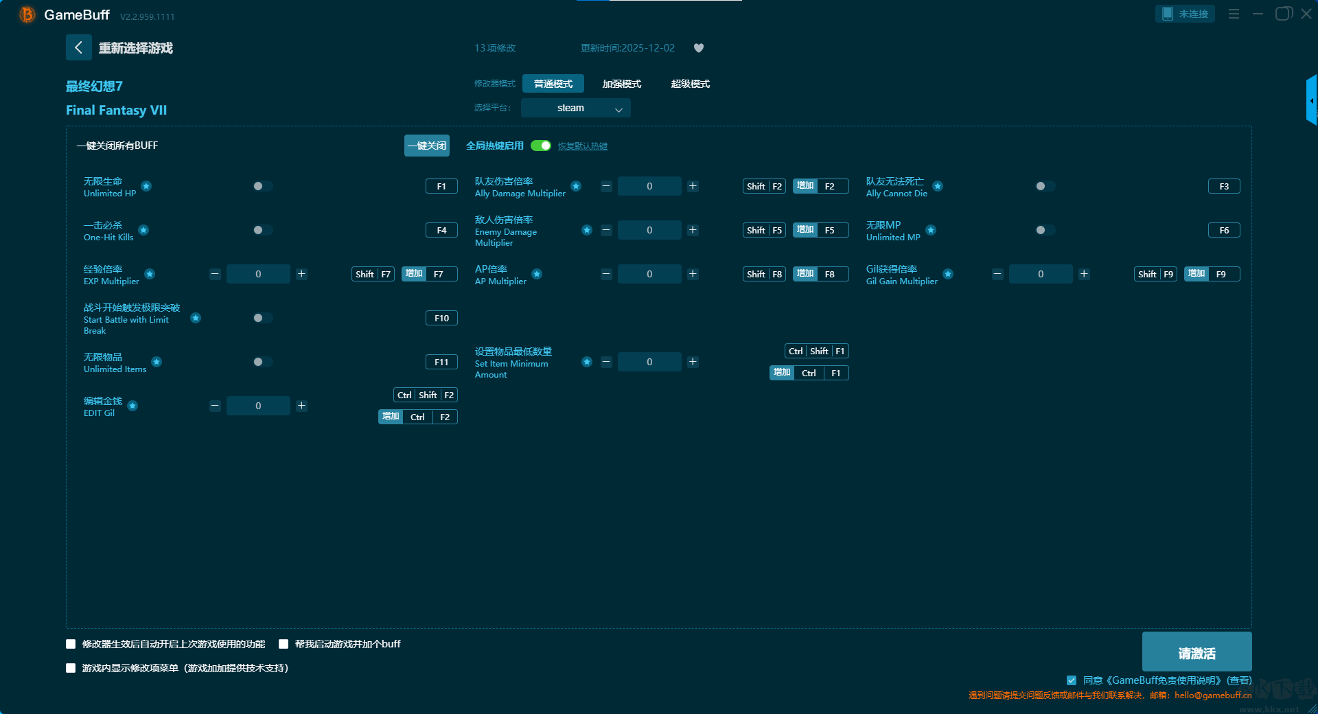 最終幻想7十三項(xiàng)修改器pc豪華版是一款功能超級(jí)強(qiáng)大的游戲輔助修改器,支持為超7000+的游戲進(jìn)行游戲修改輔助。玩家可在游玩最終幻想7的過程中一鍵開啟,無限生命、一擊必殺、經(jīng)驗(yàn)倍率、戰(zhàn)斗開始觸發(fā)極限突破、無限物品、編輯金錢、隊(duì)友傷害倍率等修改功能。需要的小伙伴快來KK下載站下載體驗(yàn)吧。