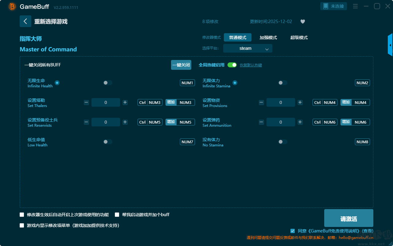 Master of Command八項(xiàng)修改器pc純綠版是一款功能強(qiáng)大的游戲輔助工具,可在三項(xiàng)修改模式中選擇一項(xiàng)開(kāi)啟使用。支持玩家為游戲Master of Command一鍵開(kāi)啟,無(wú)限生命、無(wú)限體力、設(shè)置塔勒、設(shè)置物資、設(shè)置預(yù)備役士兵、設(shè)置彈藥、低生命值、沒(méi)有體力等8項(xiàng)普通模式修改功能。需要的小伙伴快來(lái)KK下載站下載體驗(yàn)一下吧。