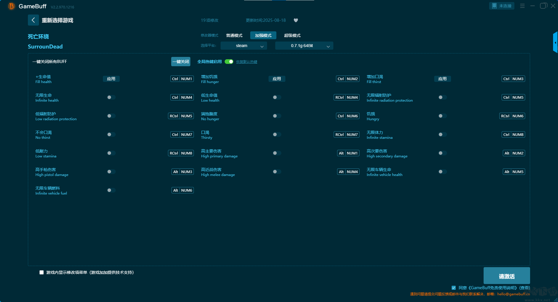 死亡環(huán)繞二十四項修改器pc免費版這是一款專業(yè)的游戲輔助修改功能,純綠色、安全、無毒,你可以放心的開啟一場別樣的暢爽游戲游玩之旅。你可以在死亡環(huán)繞這款游戲中一鍵開啟,無限生命、無限體力、體力消耗百分比、饑餓消耗百分比、口渴消耗百分比、輻射值消耗百分比等超多的修改功能??靵鞬K下載站下載這款修改器開始暢游吧。