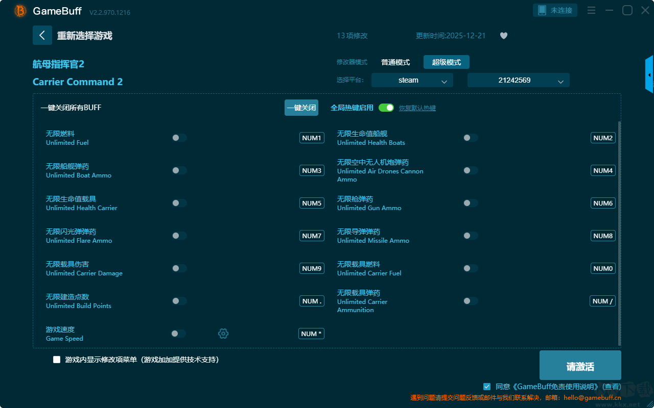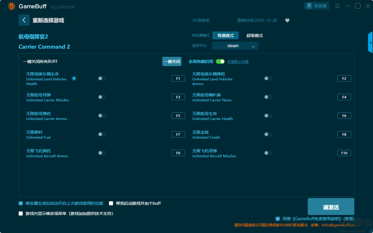 航母指揮官2十項修改器pc官方版是一款功能強(qiáng)大的游戲輔助功能,支持在steam平臺使用。你可以在這款修改器中為游戲航母指揮官2一鍵開啟,無限地面車輛生命、無限地面車輛彈藥、無限航母導(dǎo)彈、無限航母喇叭 / 障、無限航母彈藥、無限航母生命、無限燃料等超多項的修改功能。喜歡這款修改器的小伙伴快來KK下載站下載體驗吧。