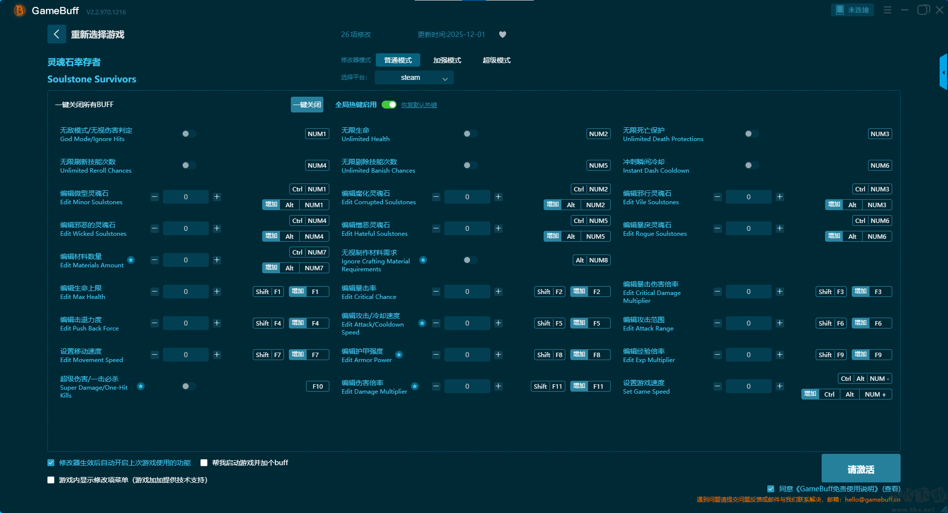 靈魂石幸存者二十六項修改器pc官方版是一款能夠以一鍵式操作降低游戲門檻,提升探索樂趣的強力游戲輔助修改器。小伙伴們可在靈魂石幸存者這款游戲中一鍵開啟,無敵模式 / 無視所有打擊、無限重新挑戰(zhàn)次數(shù)、編輯微型靈魂石、編輯邪惡靈魂石、編輯材料數(shù)量、編輯生命值上限等強力修改功能。快來KK下載站下載體驗吧。