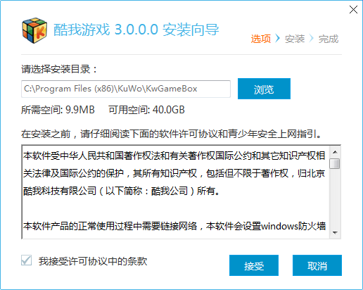 1.到本站下載安裝酷我游戲盒,打開安裝程序,勾選接受此協(xié)議
