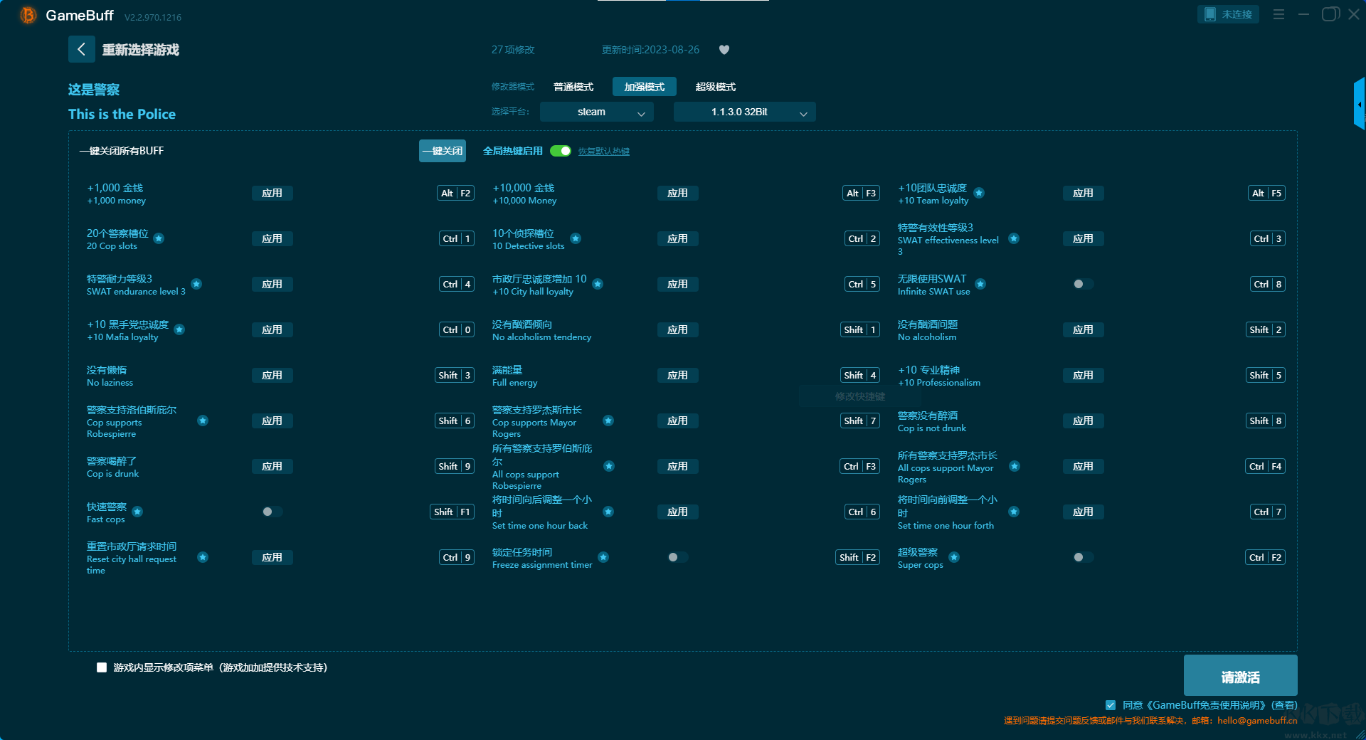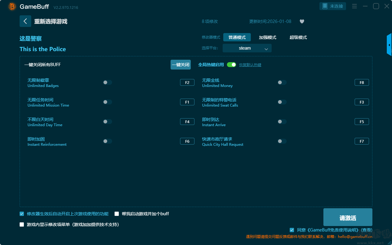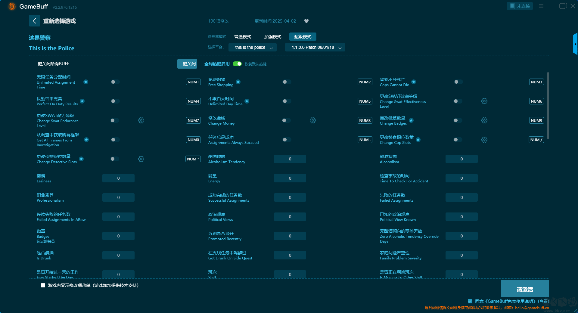 這是警察八項(xiàng)修改器pc完整版是一款集成了海量熱門游戲的修改腳本,為玩家提供更自由、更輕松的游戲體驗(yàn)的強(qiáng)力游戲修改工具。玩家可在這款修改器中為游戲這是警察開(kāi)啟,無(wú)限制徽章、無(wú)限任務(wù)時(shí)間、不限白天時(shí)間、即時(shí)加固、無(wú)限金錢、無(wú)限制的特警電話、即時(shí)到達(dá)、快速市政廳請(qǐng)求等多樣修改功能??靵?lái)KK下載站下載使用吧。