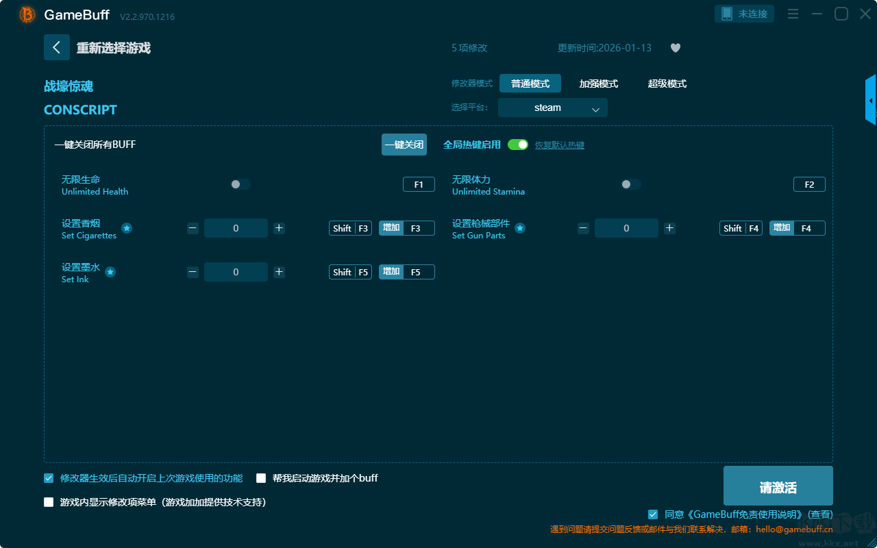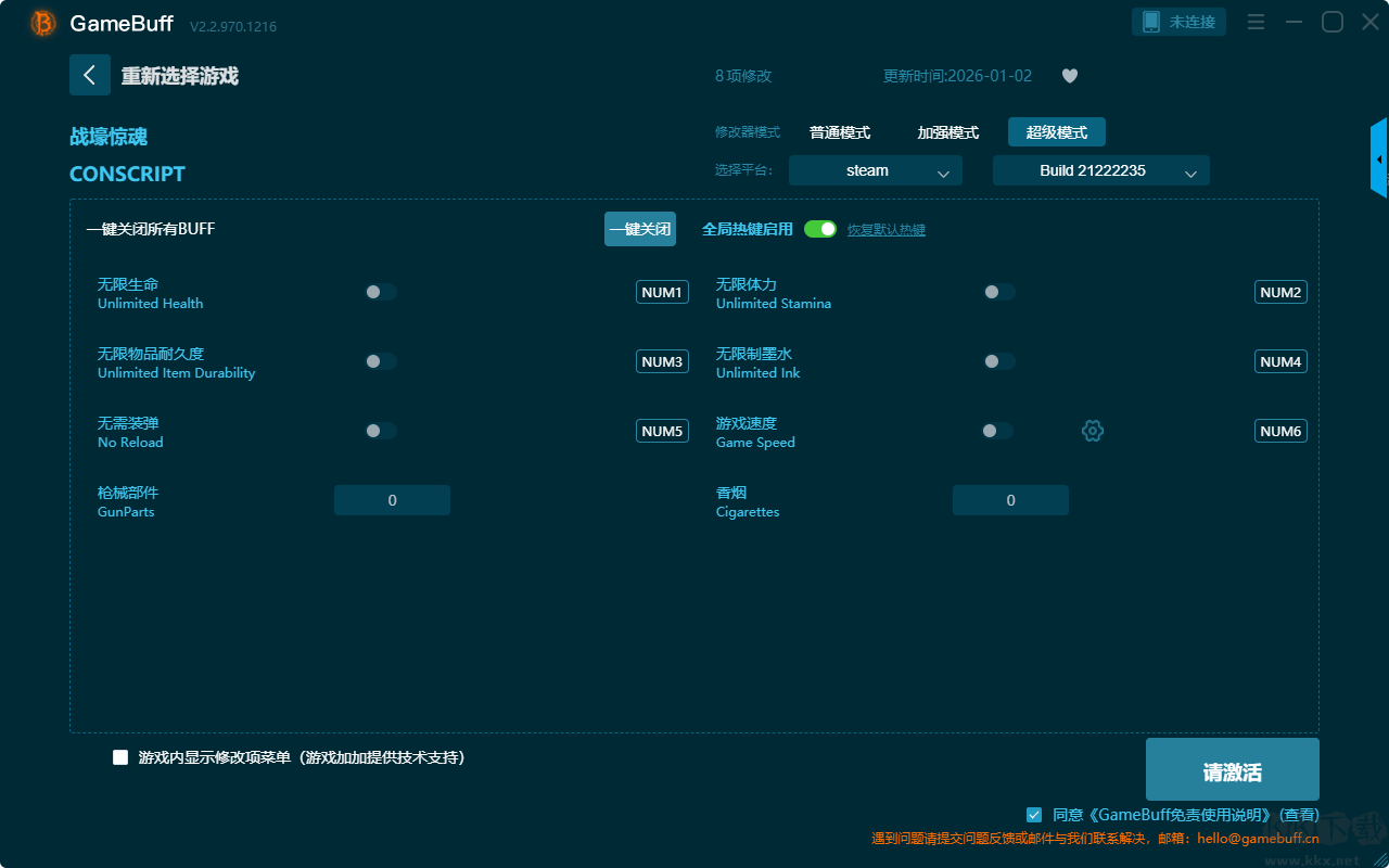 戰(zhàn)壕驚魂五項(xiàng)修改器pc正版是一款集成了智能識別、海量腳本與深度定制功能的綜合性游戲輔助平臺。支持在steam平臺為游戲戰(zhàn)壕驚魂一鍵開啟,無限生命、無限體力、設(shè)置香煙、設(shè)置槍械部件、設(shè)置墨水、無需裝彈、游戲速度、槍械部件、香煙等超多修改功能。需要這款修改器的小伙伴快來KK下載站下載體驗(yàn)一下吧。