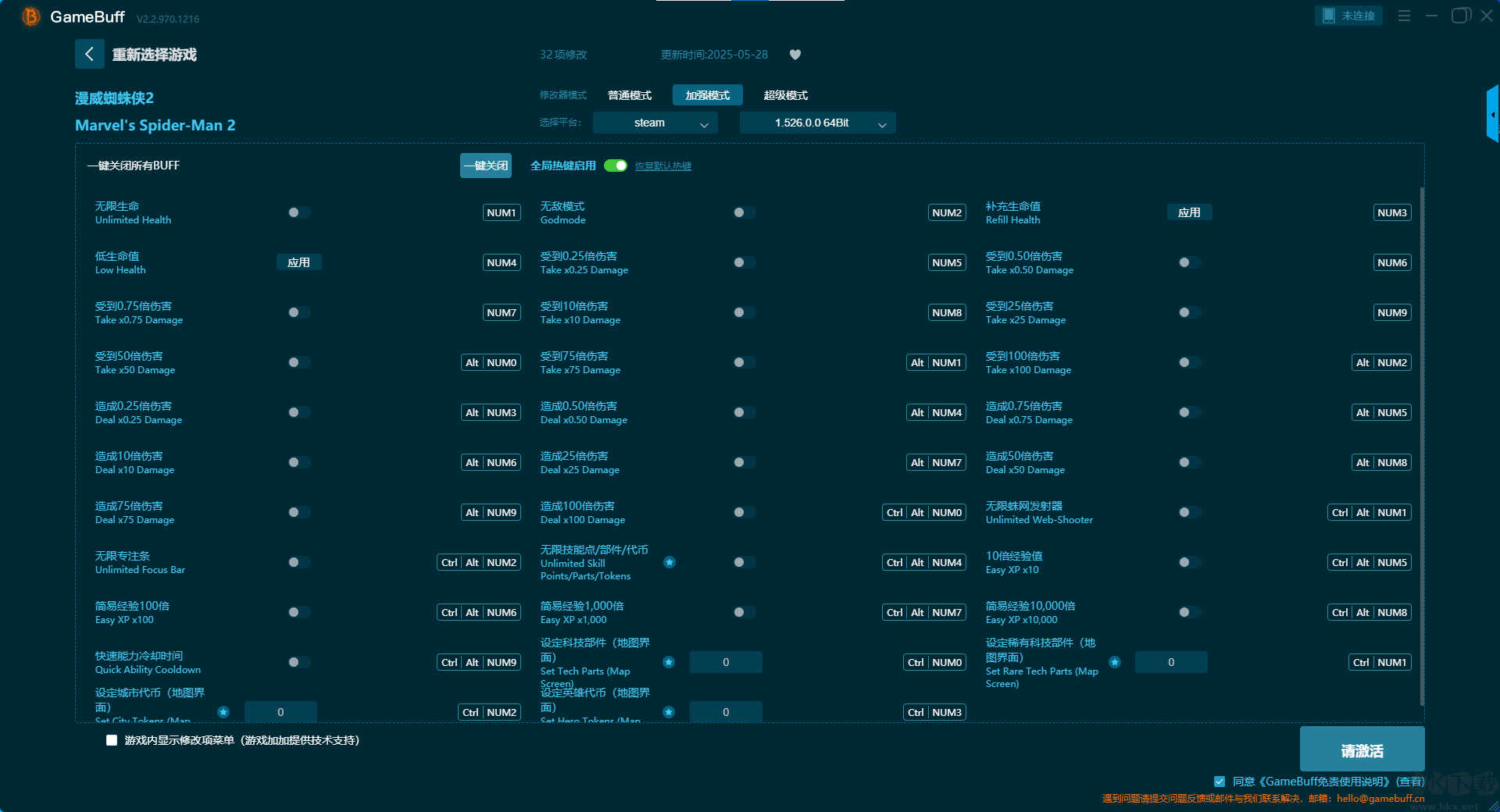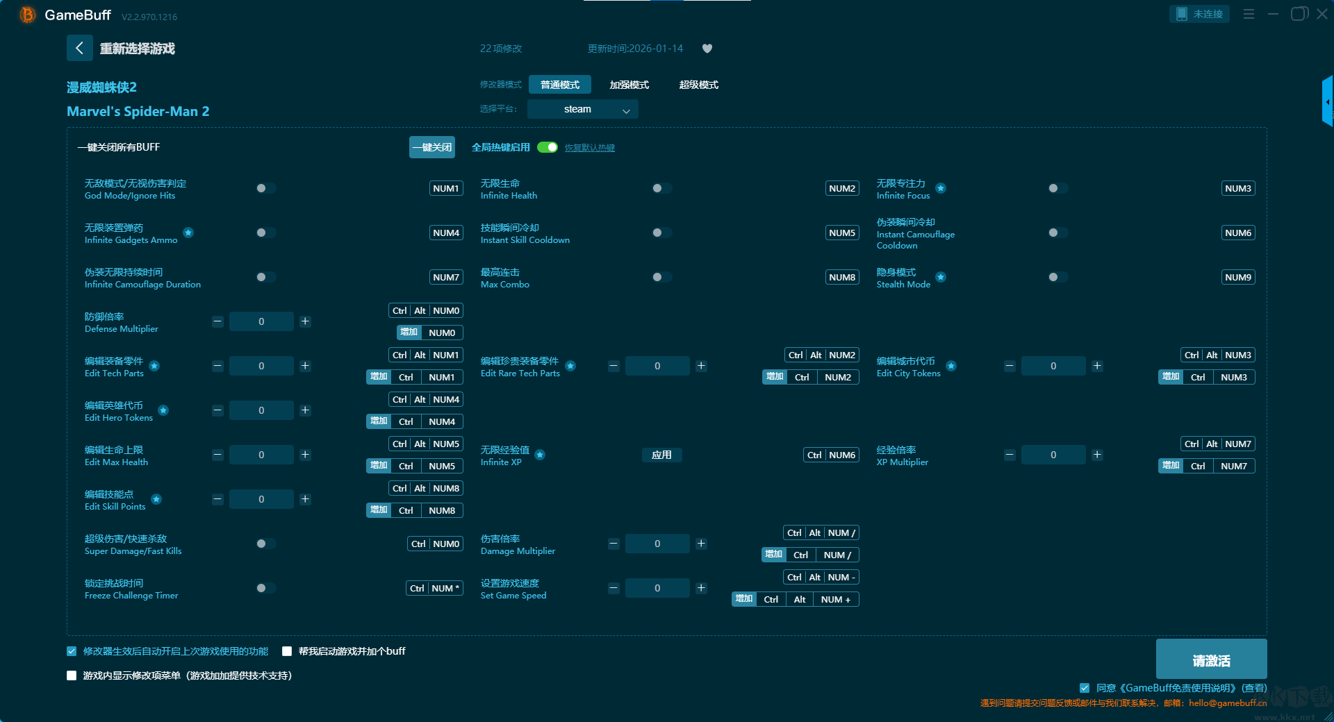 漫威蜘蛛俠2二十二項(xiàng)修改器pc綠色版加強(qiáng)模式修改功能介紹