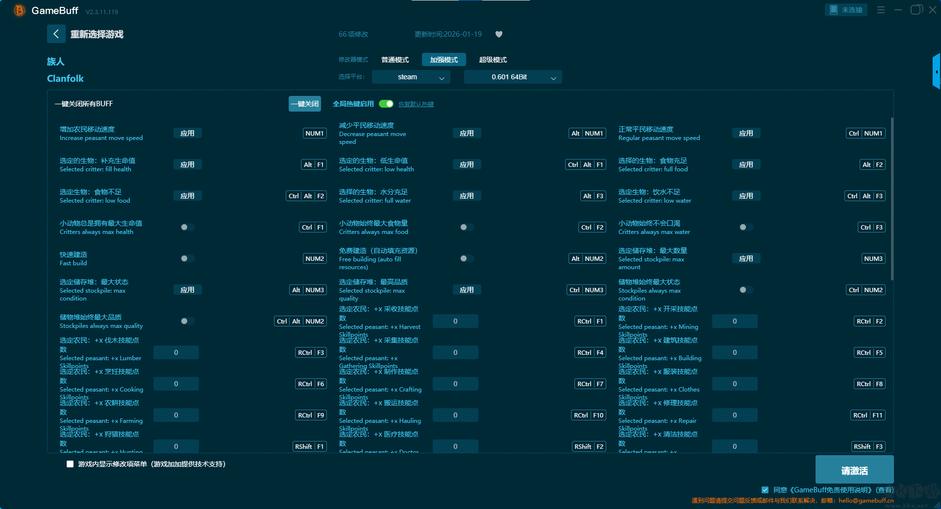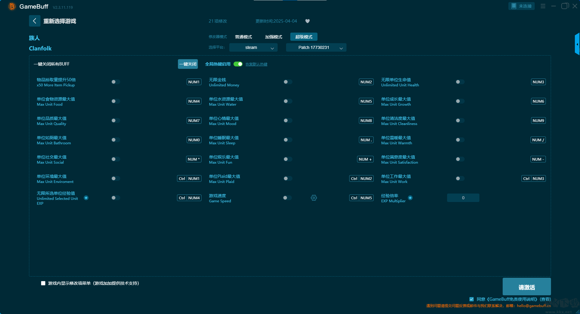 族人八項修改器pc最終版是一款集游戲加速、參數(shù)修改、資源優(yōu)化及社區(qū)交流于一體的綜合性游戲輔助平臺。你可以在這款修改器中為游戲族人一鍵開啟,無限金錢、心情不降低、立刻完成制作、編輯金錢、角色屬性不減少、無限世界點數(shù)、游戲速度等超度修改功能。打破了游戲本身的限制,賦予玩家更多掌控權,讓你以最舒適、最自由的方式暢玩。