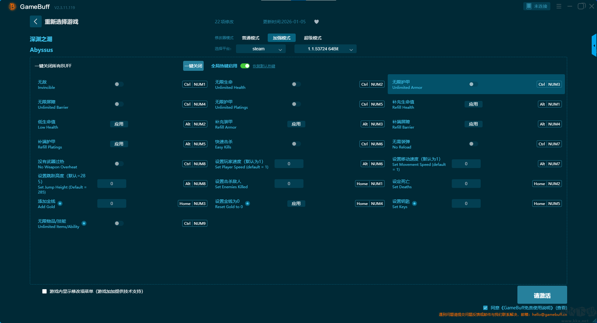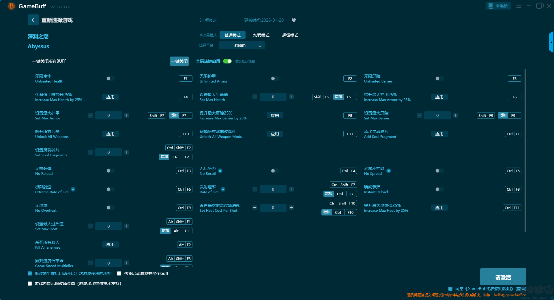 深淵之潮三十一項(xiàng)修改器pc最新版是一款致力于成為玩家手中的全能游戲助手,幫助你打破數(shù)值的枷鎖,重新定義屬于你的游戲節(jié)奏。你可以在這款游戲中為游戲深淵之潮一鍵開(kāi)啟,無(wú)限生命、生命值上限提升 25%、設(shè)置最大護(hù)甲、解鎖所有武器、設(shè)置靈魂碎片、無(wú)需裝彈、極限射速、無(wú)過(guò)熱、設(shè)置最大過(guò)熱值等修改功能??靵?lái)KK下載站下載體驗(yàn)吧。