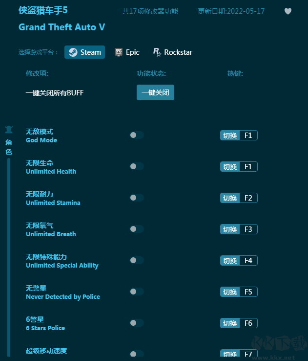 GTA5修改器擁有GTA5游戲的17項(xiàng)游戲修改功能,包括角色無限生命,無警心,武器,武器爆炸,車輛耐久,6警心,超級(jí)奔跑等等共17項(xiàng)。有了這些功能,你能夠更愉快的在GTA5的世界做你想做的事!感興趣的朋友不要錯(cuò)過,KK下載站推薦大家下載體驗(yàn)!