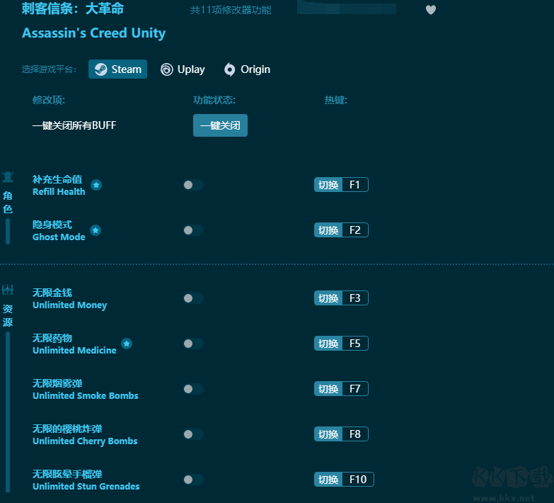 刺客信條大革命修改器是為廣大游戲愛好者提供的一款刺客信條大革命作弊器,讓玩家可以更加輕松的游戲,克服游戲中的各種困難,刺客信條大革命修改器為大家提供了快速補(bǔ)充生命、隱身模式、無限金錢、無限藥品、無限煙霧彈、無限的眩暈手榴彈等11項(xiàng)功能,有喜歡的朋友趕緊下載使用吧!