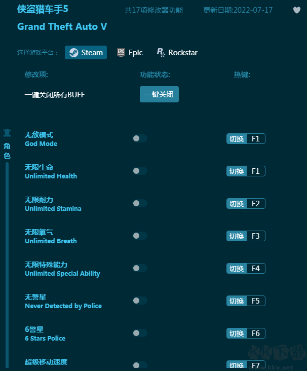 GTA5修改器是一款外置最新版的GTA5游戲修改器軟件。內(nèi)置十七項游戲修改,包括無敵,無限資源,無限金錢等等,能夠幫助玩家最大限度的降低游戲難度!感興趣的朋友不要錯過,KK下載站推薦大家下載體驗!