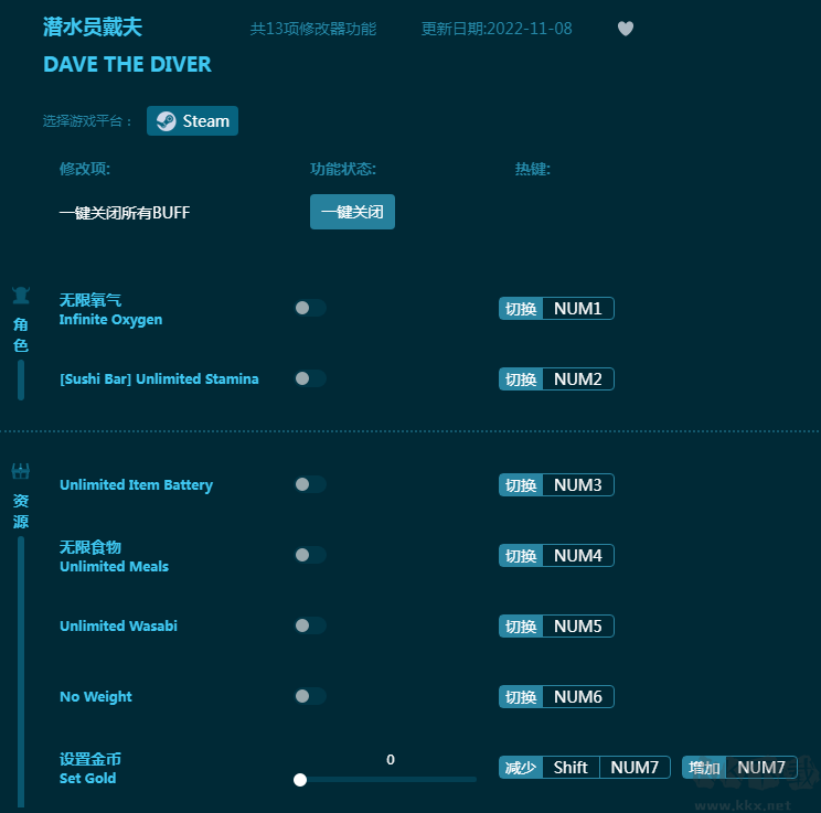 《潛水員戴夫》是近期好評(píng)如潮的像素風(fēng)模擬經(jīng)營(yíng)游戲。白天下海捕魚,晚上壽司店打工,多樣化玩法,眾多游戲元素,一起來(lái)海洋里捕魚吧!KK下載站帶來(lái)《潛水員戴夫修改器》幫助玩家輕松捕捉大魷魚,提供無(wú)限氧氣,無(wú)限食物,無(wú)限金幣等功能,捕魚無(wú)所畏懼!感興趣的朋友不要錯(cuò)過(guò),KK下載站推薦大家下載體驗(yàn)!