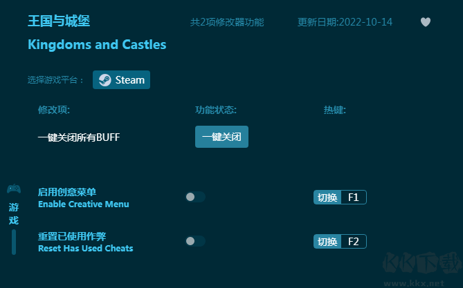 《王國(guó)與城堡》是一款王國(guó)模擬建造經(jīng)營(yíng)游戲,建立你的王國(guó)并努力生存發(fā)展,對(duì)抗入侵。這款《王國(guó)與城堡修改器》為玩家提供游戲內(nèi)置修改器,玩家可以自由開(kāi)啟游戲輔助功能,讓你的王國(guó)發(fā)展更壯大,游戲體驗(yàn)更佳!感興趣的朋友不要錯(cuò)過(guò),KK下載站推薦大家下載體驗(yàn)!
